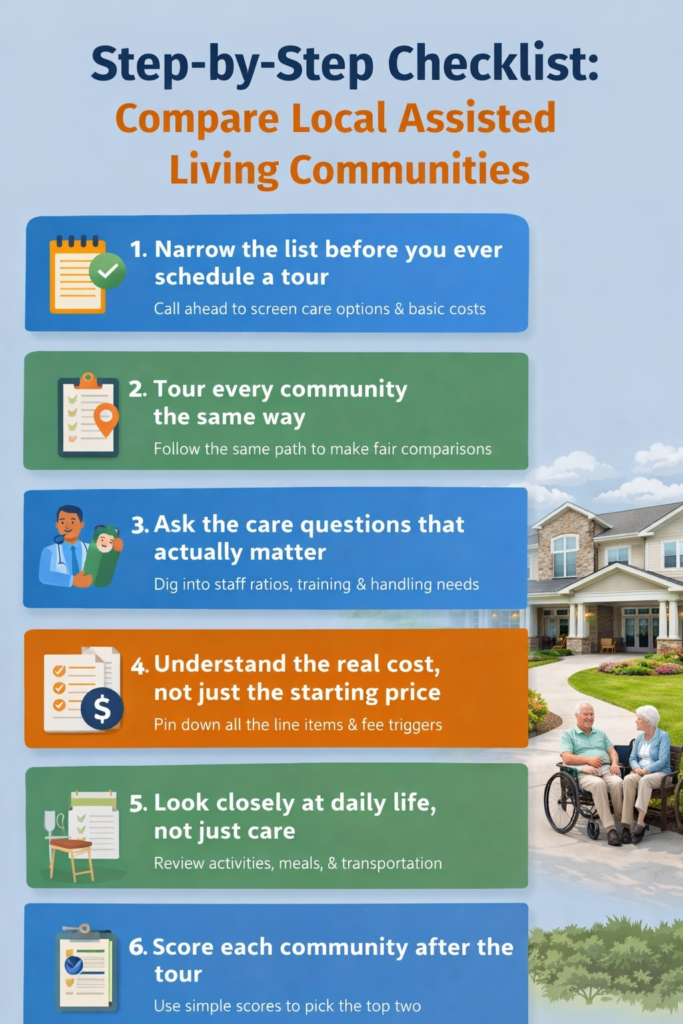 Instead of relying on gut feelings or sales presentations, you’ll walk away with a clear, repeatable way to compare assisted living communities side by side, based on what actually affects safety, cost, and daily life.